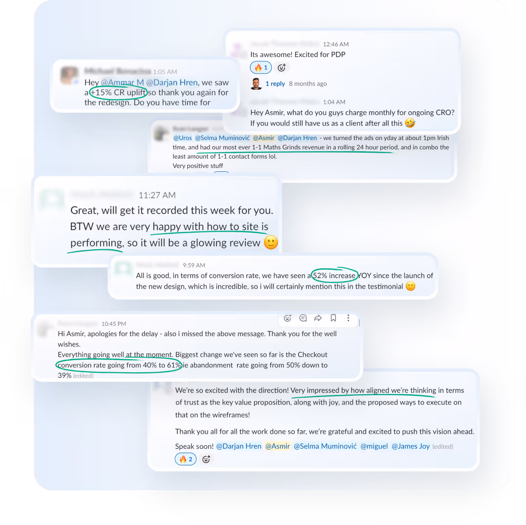 We are not aiming for 2% uplifts. We swing big and only test things that will make a real difference in your bottom line. We've optimized conversions, earning millions for 140+ companies spanning over 40 different countries. Our team has the experience your business deserves.