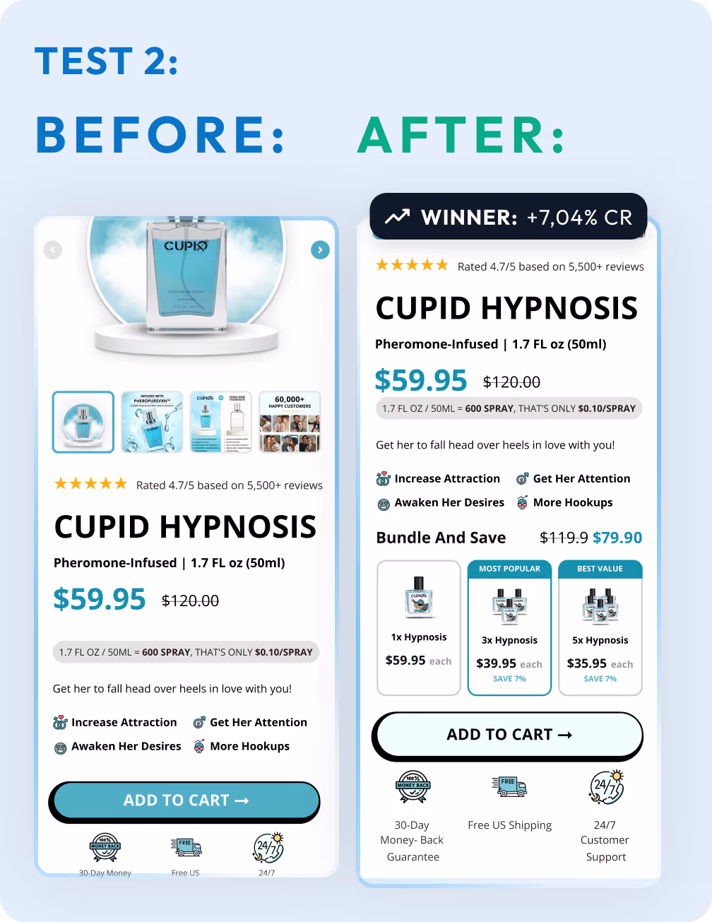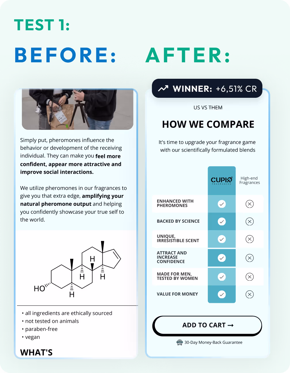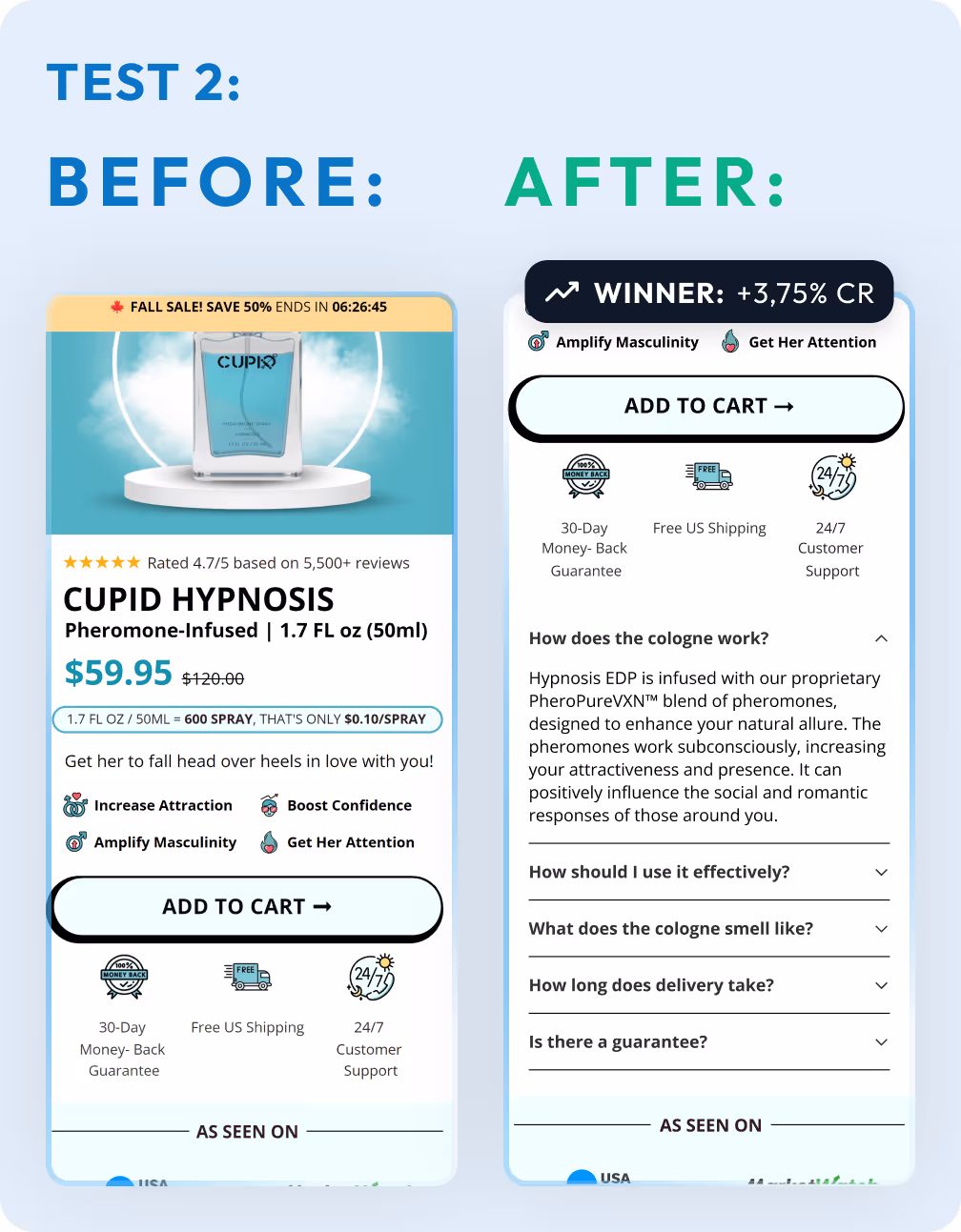 boosting perceived value: We encountered significant hesitation around pricing, with heatmaps showing drop-offs near the price section and customer feedback indicating skepticism about the product’s worth compared to traditional colognes. Many users didn’t fully grasp the point behind pheromones, leading them to perceive Cupid’s fragrance as a gimmick rather than a premium product. To counter this, we focused on strategic price justification, premium ingredient highlights, optimized bundling, and stronger social proof to reinforce exclusivity and value perception.