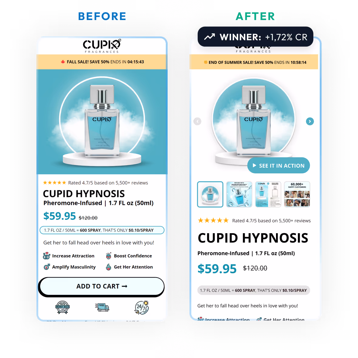 Cupid Fragrances is an 8-figure Shopify store offering premium pheromone perfumes for men. With an elegant aesthetic and a focus on quality, Cupid's products promise to enhance allure and boost confidence. However, as a niche product, it faces a unique set of challenges when it comes to building trust and converting visitors into buyers.